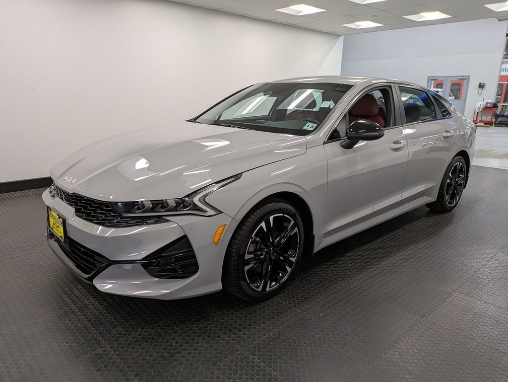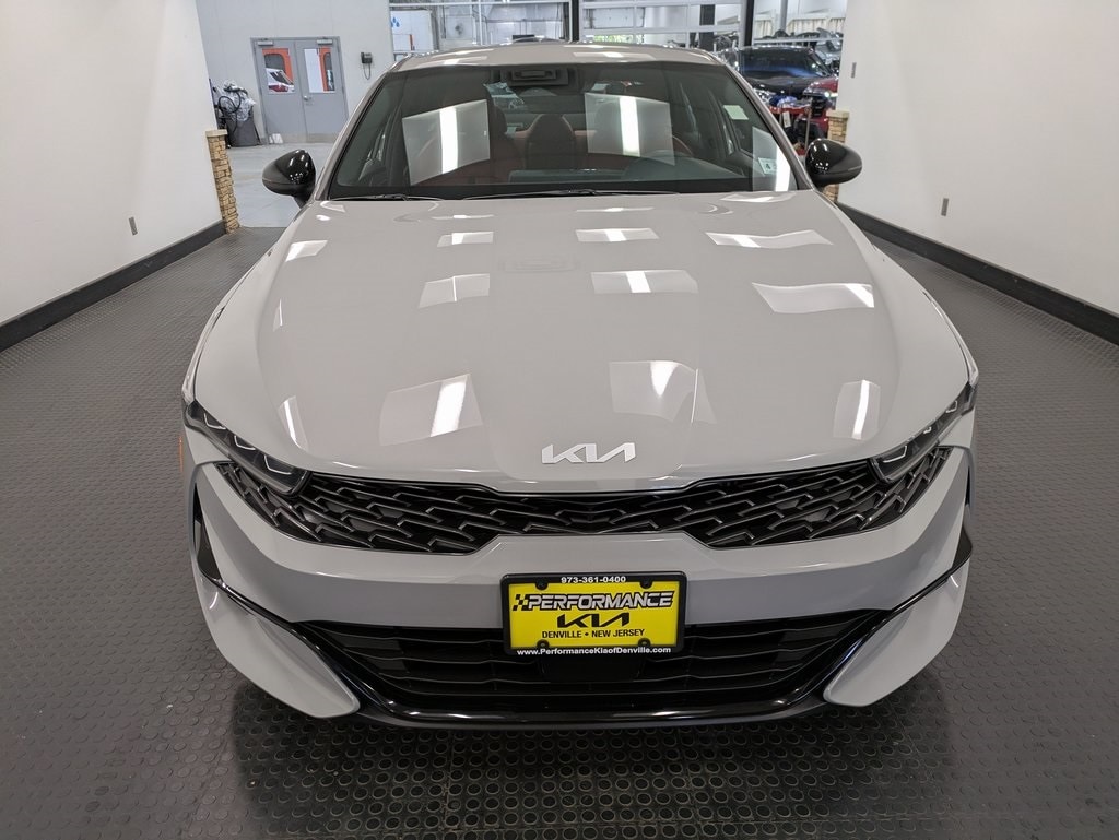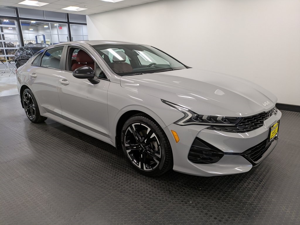 Certified. Wolf Gray 2023 Kia K5 GT-Line AWD 8-Speed Automatic 1.6L I4 DGI Turbocharged DOHC 16V LEV3-ULEV70 180hp 4-Wheel Disc Brakes, 6 Speakers, ABS brakes, Air Conditioning, Alloy wheels, AM/FM radio: SiriusXM, Apple CarPlay & Android Auto, Auto High-beam Headlights, Automatic temperature control, Brake assist, Bumpers: body-color, Cargo Mat, Cargo Net, Carpeted Floor Mats, Cloth/SynTex Seat Trim, Delay-off headlights, Driver door bin, Driver vanity mirror, Dual front impact airbags, Dual front side impact airbags, Electronic Stability Control, Forward Collision Avoidance-Assist, Four wheel independent suspension, Front anti-roll bar, Front Bucket Seats, Front Center Armrest, Front dual zone A/C, Front fog lights, Front reading lights, Fully automatic headlights, GT-Line Premium Package, GT-Line Red Interior Package, Heated door mirrors, Highway Driving Assist, Illuminated entry, Knee airbag, LED Projection Headlamps, Low tire pressure warning, Navigation System, Occupant sensing airbag, Outside temperature display, Overhead airbag, Overhead console, Panic alarm, Passenger door bin, Passenger vanity mirror, Power door mirrors, Power driver seat, Power steering, Power windows, Radio data system, Radio: AM/FM/MP3 Audio System, Rear anti-roll bar, Rear seat center armrest, Rear side impact airbag, Rear window defroster, Remote keyless entry, Security system, Smart Cruise Control w/Stop & Go, Speed control, Speed-sensing steering, Split folding rear seat, Spoiler, Sport steering wheel, Steering wheel mounted audio controls, Tachometer, Telescoping steering wheel, Tilt steering wheel, Traction control, Trip computer, Turn signal indicator mirrors, Variably intermittent wipers, Wheels: 18" Gloss Black Machined Finish Alloy.