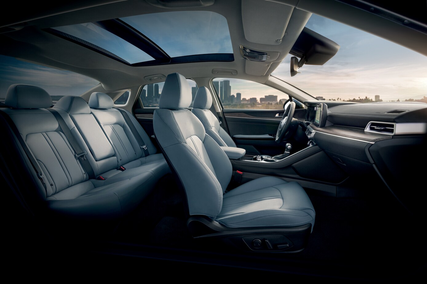 Inside the spacious cabin, the K5 surrounds you with premium materials and thoughtful amenities. The SynTex seat trim provides a leather-like feel, while heated and ventilated front seats are available on select trims for all-season comfort. An optional panoramic sunroof floods the interior with natural light, creating an open and airy ambiance. The available Bose premium audio system with 12 speakers delivers immersive sound quality to enhance your music, podcasts, and more. The interior of the new K5 offers impressive refinement and innovation for drivers and passengers alike.